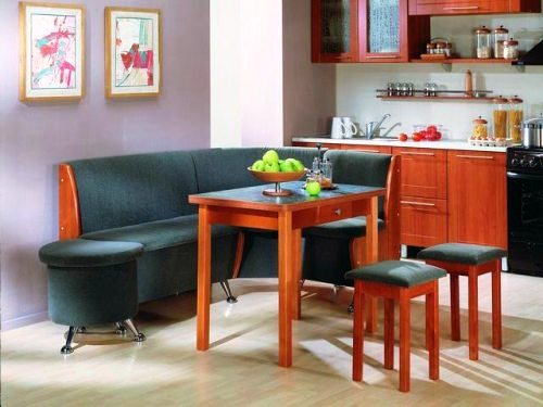 Кухонные уголкиУголки для кухни представляют собой комплект мебели, который состоит из небольшого дивана, стульев и стола. К достоинствам подобных гарнитуров относят то, что они невероятно компактны, что особенно подходит для хозяина маленькой кухни.Уголки производят из металла, ДСП и натурального дерева. Выбирая материал покрытия для уголков, в первую очередь следует опираться на его практичность, ведь на кухонном пространстве это особенно актуально.